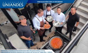 Ante la necesidad de brindar un manejo adecuado de productos alimenticios los Emprendedores Turísticos miembros de la Cámara de Turismo de Tungurahua y UNIANDES, se reúnen con autoridades y docentes de la Carrera de Gastronomía para desarrollar un proyecto de vinculación que permita mejorar el componente de seguridad, higiene y elaboración de los productos al menos en un 90%, que potencialicen el gastronómico del sector; en la reunión se realizó el levantamiento de necesidades de Innovación y Transformación de Línea de Producción Gastronómica con los Emprendedores Turísticos miembros de la Cámara de Turismo de Tungurahua.