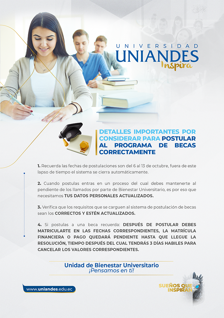 La Universidad Regional Autónoma de Los Andes UNIANDES, en cumplimiento de la Ley Orgánica de Educación Superior de lo que establece en el Artículo 77: Becas y ayudas económicas. – Las instituciones de educación superior establecerán programas de becas completas, o su equivalente en ayudas económicas a por lo menos el 10% del número de estudiantes regulares, en cualquiera de los niveles de formación de la educación superior. Nuestra universidad cuenta con el programa de becas las mismas que cubren hasta el 100% en matrícula y colegiaturas. Entendiendo que una beca es la subvención total o parcial otorgada por las instituciones de educación superior.