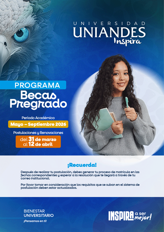 El Área de Bienestar Biopsicosocial de la Unidad de Bienestar Estudiantil Universitaria de UNIANDES ayuda a la Comunidad Universitaria a realizar sus proyectos de vida en los ámbitos personales, académicos y laborales, a través del proceso de Apoyo Social, mediante los servicios y mediante el Programa de Desarrollo Profesional mediante el otorgamiento de Becas para los funcionarios, docentes, Servidores, así como para sus hijos o esposos, en el caso del personal que sea soltero serán beneficiados sus padres, hermanos y sobrinos mediante Becas estudiantiles.